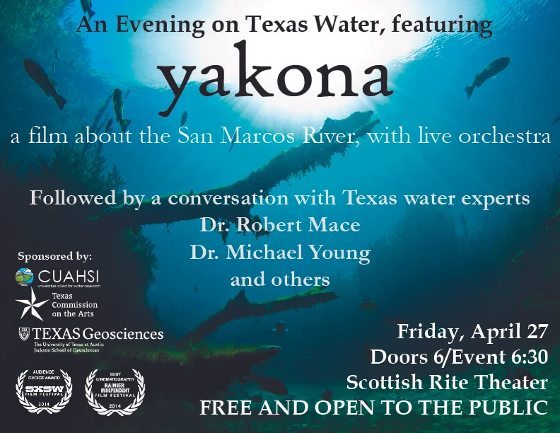 The event will take place on Friday, April 27, at 6 p.m. at the Austin Scottish Rite Theater and includes a screening of the multi-award winning film “Yakona” with the film score performed by a musical group. The screening will be followed by a panel discussion with water experts, policy makers and advocates.