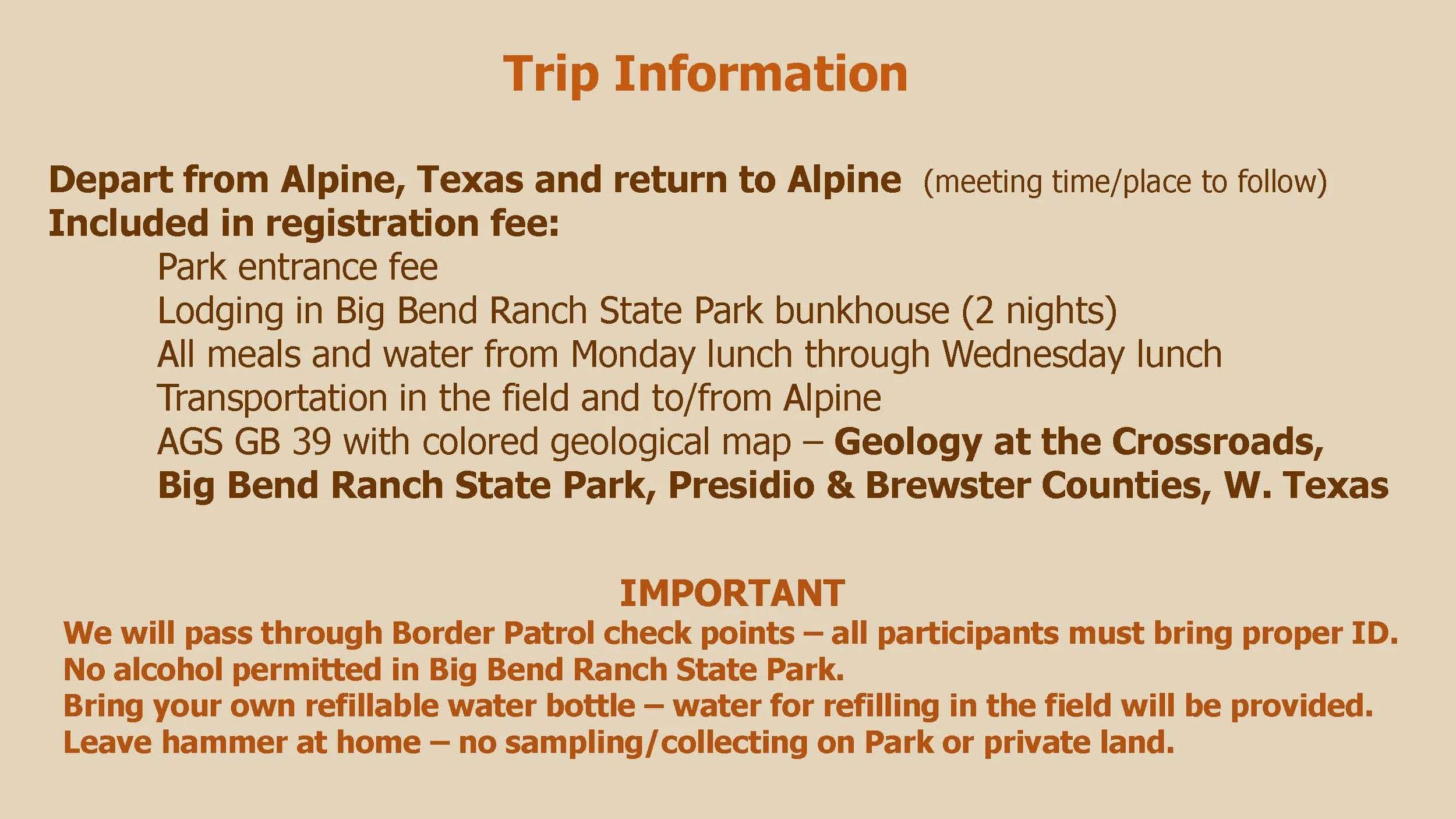 This location will be the starting and ending points for the trip and all field trip participants will need to assemble there at 7:30 on Monday, February 25th, for prompt departure to Big Bend Ranch State Park. The hotel is located on the West side of town. I have also arranged for monitored parking for all personal vehicles to be left there during the trip. (Hopefully people will be carpooling where possible.) No personnel vehicles will accompany the trip.