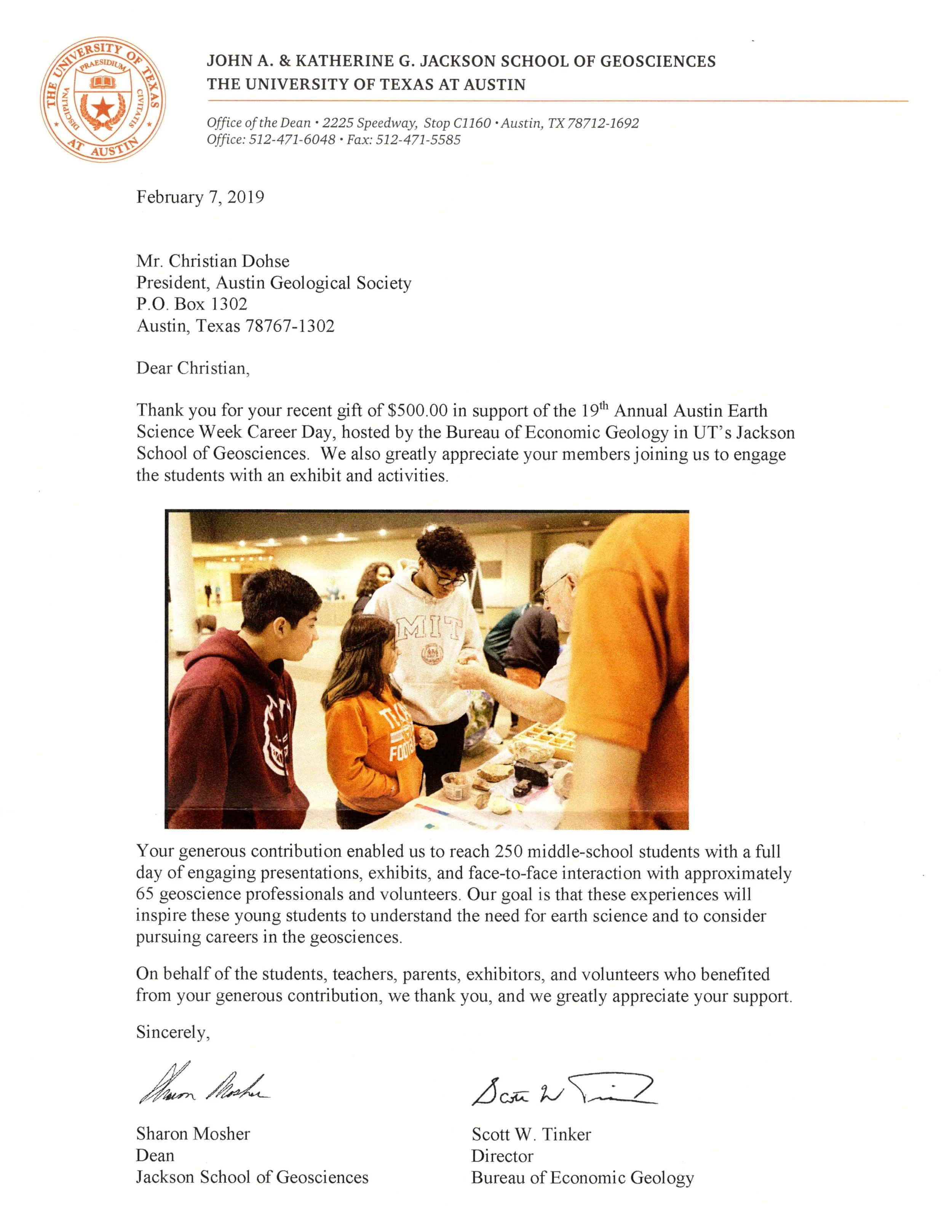 Below is a thank you letter from Dean Sharon Mosher and Scott Tinker for the financial contribution and volunteer efforts of AGS members to Earth Science Week. Special thanks to John Berry for his engagement with the students.