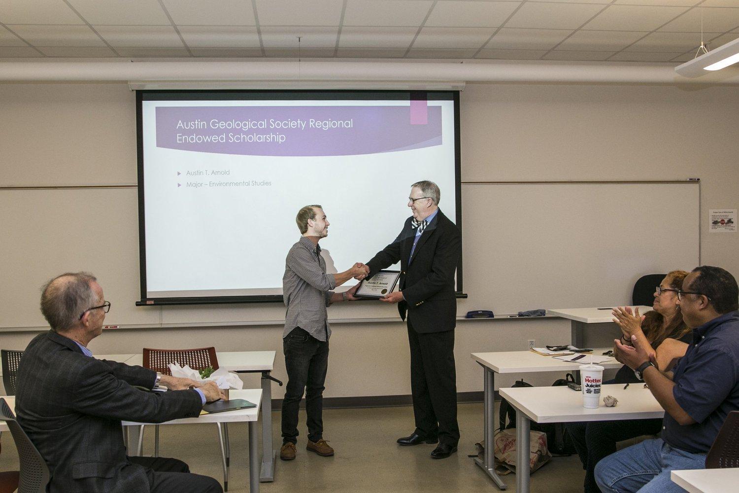Austin T. Arnold receives the first-ever award from Will Boettner. Spring 2018.